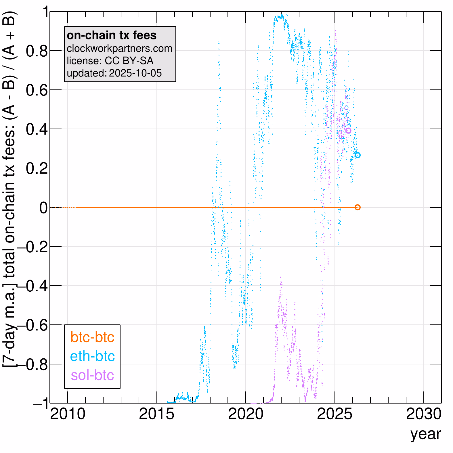 There is one dot per day. The latest dots are encircled. Data are from Coin Metrics, CoinGecko, SolanaFM, and birdeye.