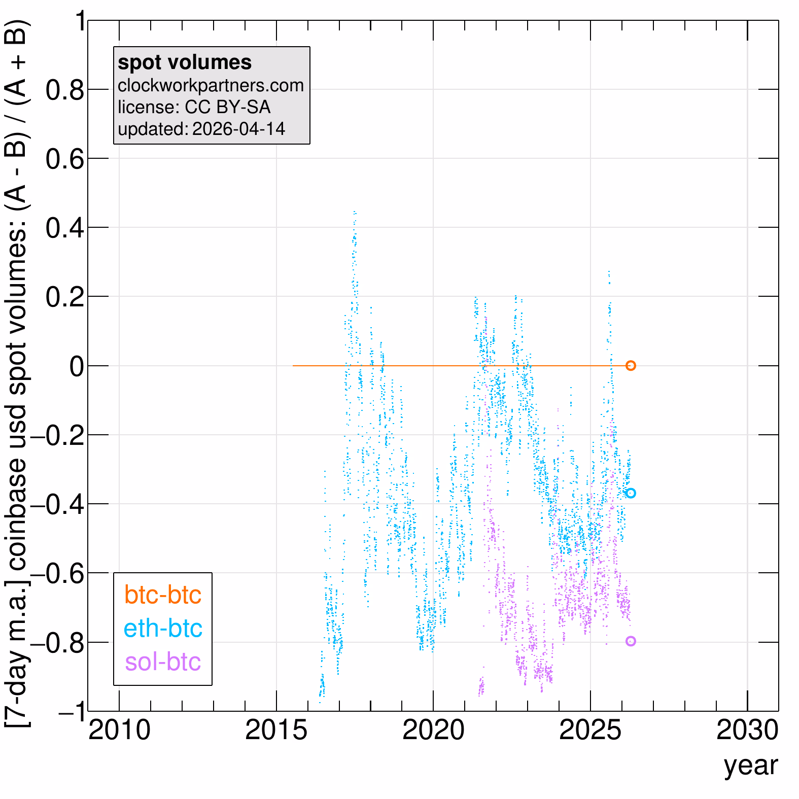 The following charts display trends in asymmetries between quantities related to bitcoin and various altcoins and tokens.