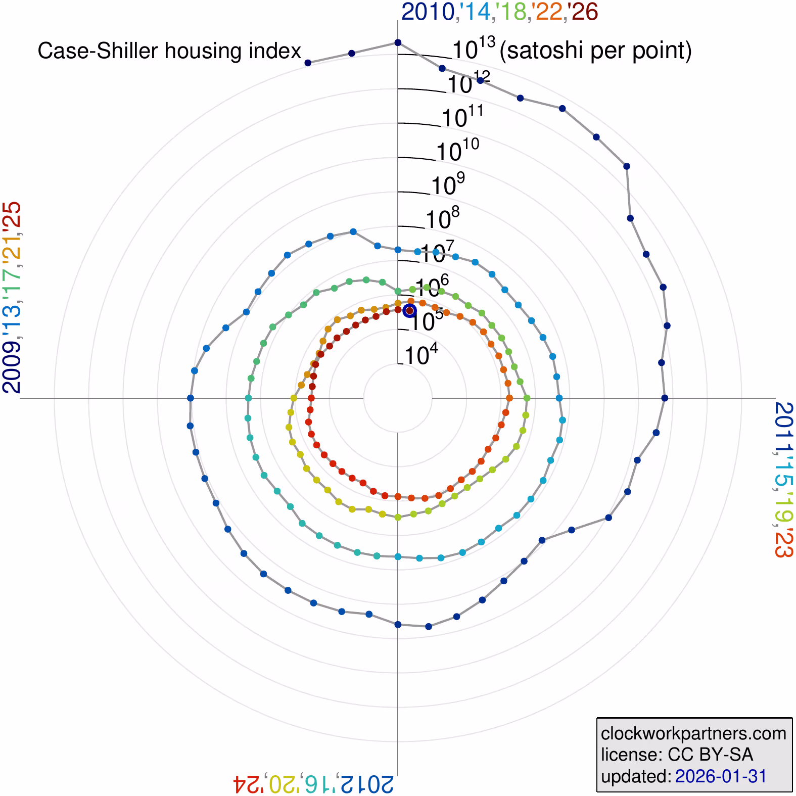 For Case-Shiller, monthly levels are represented by large dots connected by line segments.