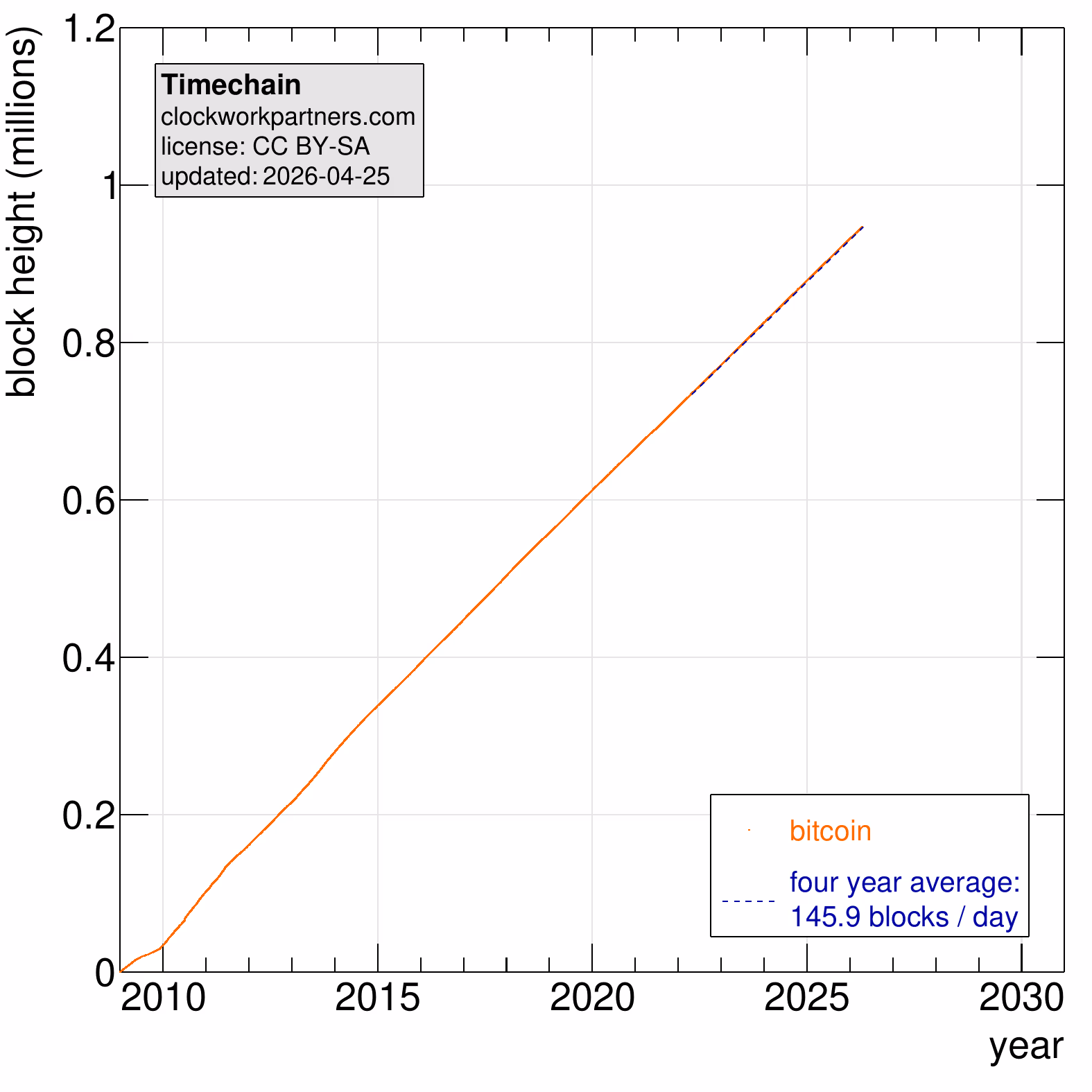 Left chart: block height vs. time. Each day is represented by an orange dot. The dashed line gives the average rate over the past four years.